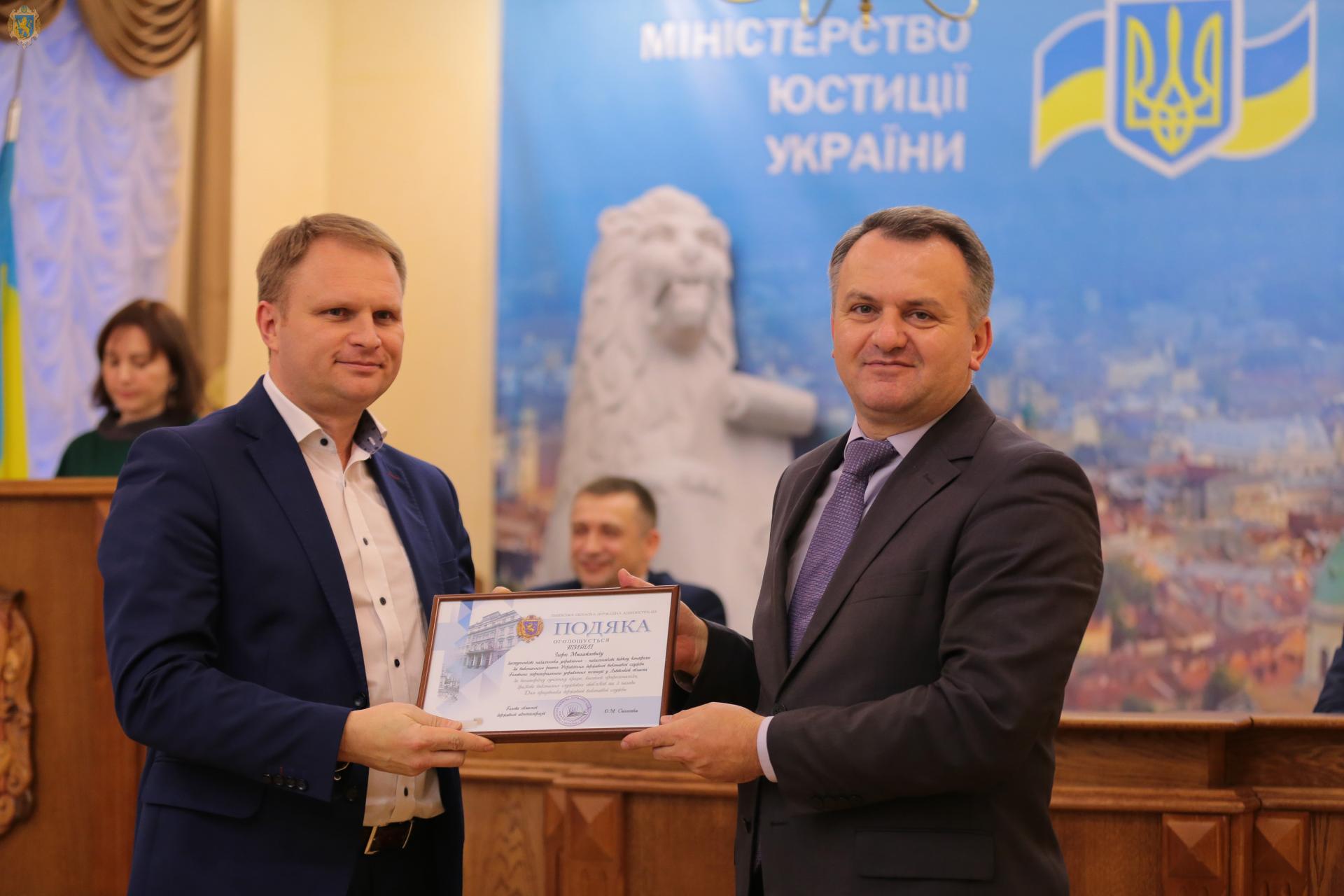 Також очільник області за багаторічну сумлінну працю, вагомий внесок у підвищення авторитету органів державної виконавчої служби, високий професіоналізм та зразкове виконання службових обов’язків відзначив подяками працівників Управління державної виконавчої служби Головного територіального управління юстиції у Львівській області.