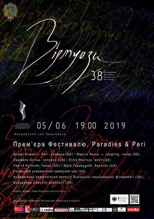 Світова прем’єра «Рай і Пері» відбулася у 1843 році, диригував сам Шуман. Ораторія викликала фурор. Критики того часу захоплювалися свіжістю музичних ідей, багатством мелодики та гармоній, досконалим оркеструванням. Геній створив музичний діамант, що не є оперою, проте визначив напрям розвитку цього жанру у ХІХ столітті. Це музика, що випередила свій час і залишається актуальною й сьогодні. Для прем’єрного виконання в Україні, в рамках 38-го Міжнародного фестивалю музичного мистецтва «Віртуози», запрошено оперних зірок з Німеччини - Штефі Лєманн (сопрано) - Peri та Мартіна Латке (тенор) – Jüngling.
