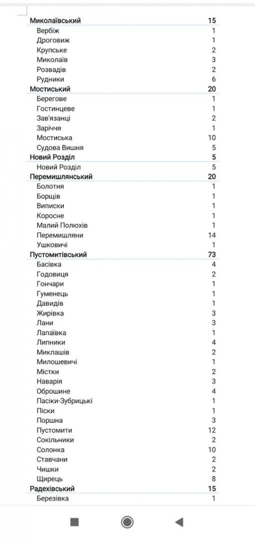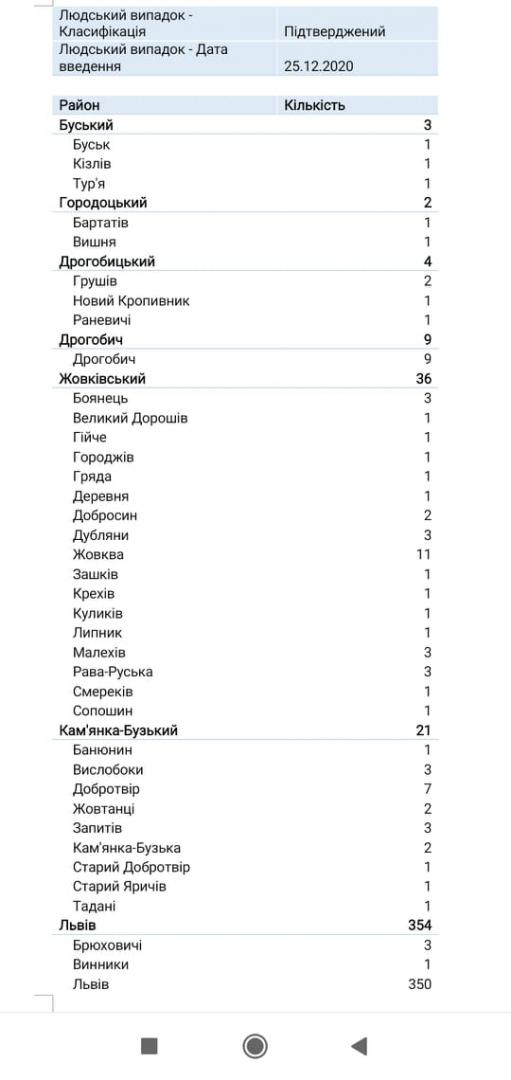За попередню добу у Львівській області провели 3077 досліджень на коронавірус. Згідно з результатами, позитивні показники виявили у 2934 людей. У розрізі районів: Дрогобицький: 199 Золочівський: 85 Львівський: 2052 (м. Львів – 1559) Самбірський: 69 Стрийський: 140 Яворівський: 194 Червоноградський: 195 Отже, за добу, що минула з діагнозом COVID-19 по Львівській області госпіталізували 156 осіб. Скерували на самоізоляцію – 1954 людини. Аналіз на ПЛР-дослідження вперше набрали у 2110 осіб. Летальних випадків - 7. В реанімації перебуває 132 пацієнти, з них на апаратах ШВЛ – 48. У стаціонарах перебувають 2012 осіб (37, 64%). Серед них 449 людей вакциновані (в т.ч. двома дозами – 415). У розрізі лікарень пацієнти перебувають (в дужках зазначена загальна кількість ліжок, розгорнутих для хворих на ковід): у Львівській обласній інфекційній лікарні (230) – 173; у Центрі легеневого здоров'я (370) – 257; у Львівському обласному госпіталі ветеранів війн та репресованих (700) – 124; у ЛОКЛ (120) – 78; у Лікарні на залізничному транспорті (100) – 0; у Львівській обласній дитячій клінічній лікарні «ОХМАТДИТ» (120) – 115; у ЛШМД (830) – 272; у Львівському обласному клінічному перинатальному центрі (50) – 19; у 8-й міській клінічній лікарні м. Львова (350) – 92; у 1-й МКЛ м. Львова (200) – 0; у 5-й МКЛ м. Львова (175) – 81; у Стрийській міській лікарні (190) – 132; у Стебницькій міській лікарні (150) – 101; у Рудківській лікарні (100) – 100; у Новояворівській РЛ №1 імені Юрія Липи (200) – 117; у Кам'янка-Бузькій ЦРЛ (120) – 90; у Сокальській ЦРЛ (326) – 33; у Жидачівській ЦРЛ (100) – 0; у Пустомитівській (80) – 0; у Перемишлянській ЦРЛ (80) – 76; у Жовківській ЦРЛ (100) – 0; у Самбірській ЦРЛ (50) – 0; у Буській ЦРЛ (80) – 0; у Золочівській ЦРЛ (80) – 60. За увесь час у Львівській області COVID-19 підтвердили у 259934 осіб. Померлих – 6218 людей. Одужали від коронавірусної інфекції – 214955 осіб.